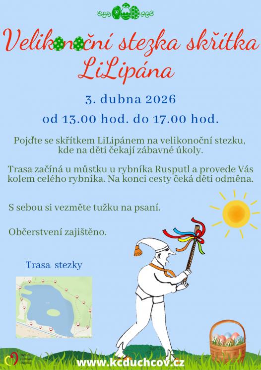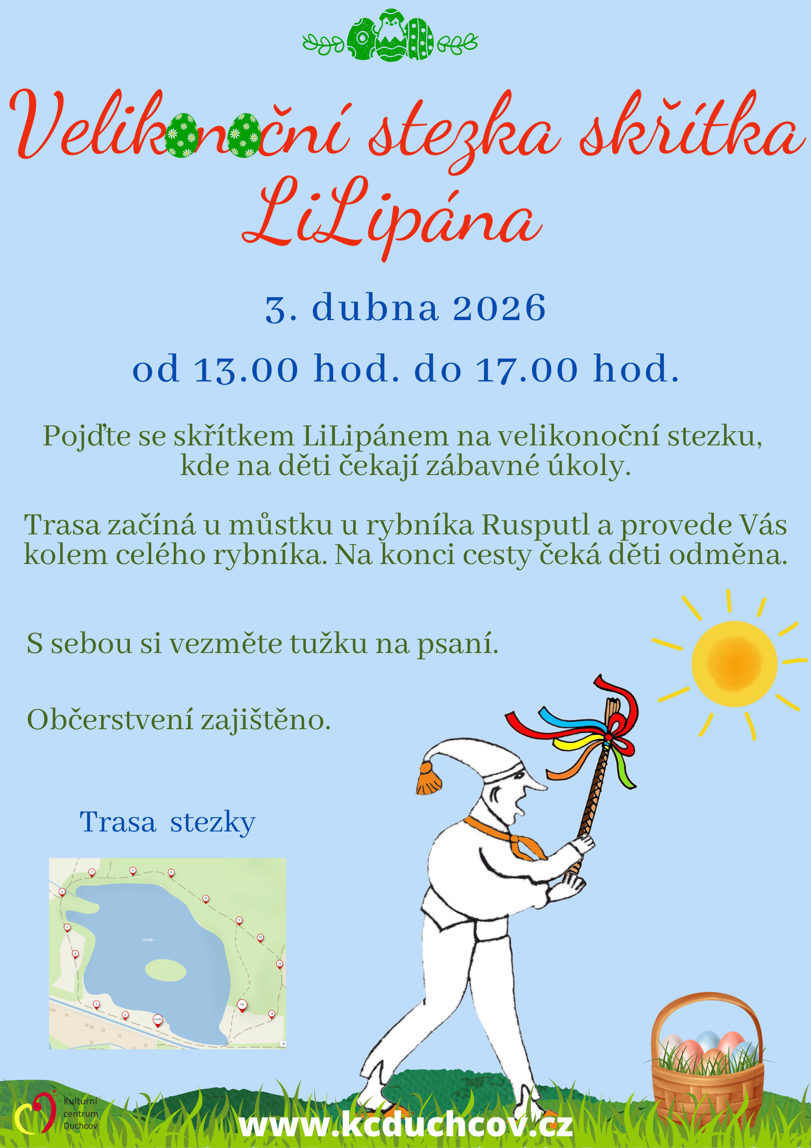 Pojďte se skřítkem LiLipánem na velikonoční stezku, kde na děti čekají zábavné úkoly. Trasa začíná u můstku u rybníka Rosputl a provede Vás kolem celého rybníka. Na konci cesty čeká děti odměna. S sebou si vezměte tužku na psaní. Občerstvení zajištěno.
