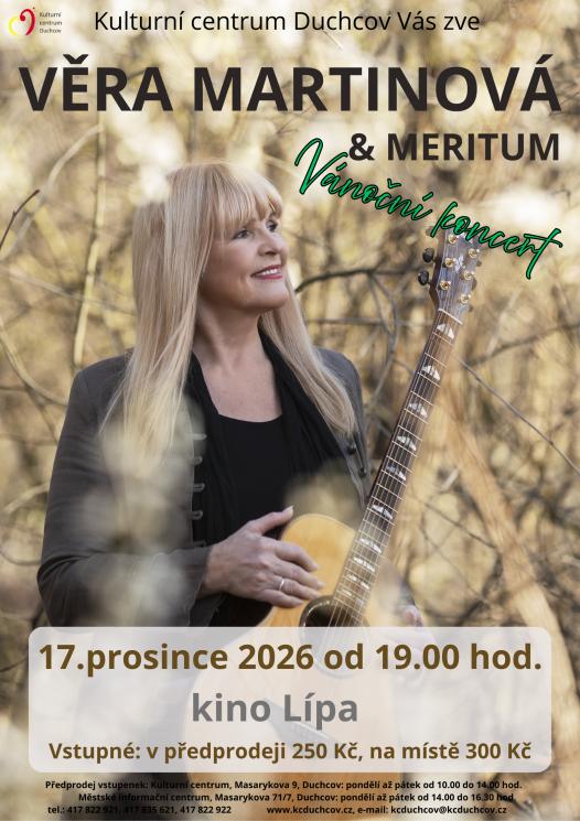 Vánoční koncert Věry Martinové se skupinou Meritum v adventním období nabídne program složený ze svátečně laděných vánočních písniček z alba "Foukneme do svící" a současně i ty největší hity Věry Martinové právě z výjimečné kompilace "Zlatá kolekce Věry Martinové – JAKO DŘÍV" a samozřejmě také písničky z posledního řadového CD s názvem "Meritum".